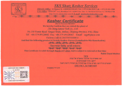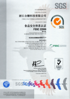 公司被評為“國家高新技術企業”,并有多個產品獲得“國內發明專利”,通過了FSSC22000食品安全體系認證,ISO14001環境管理體系,MUI HALAL認證,SKS KOSHER認證,ISO9001質量管理體系和ISO22000食品安全管理體系認證,并有多個產品通過了“歐洲REACH法規”注冊和“韓國REACH法規” 預注冊。
